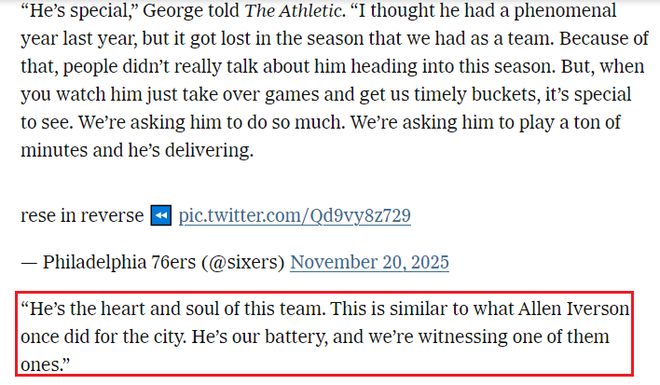 “他很特别,我觉得他上赛季表现非常出色,但因为球队整体表现太好,他的光芒被掩盖了。正因如此,赛季开始前大家并没有过多谈论他。但是,当你看到他接管比赛,在关键时刻为我们得分时,你会觉得这很特别。我们对他要求很高,让他打很多时间,而他也做到了。他是这支球队的灵魂人物。这就像当年阿伦·艾弗森为这座城市所做的那样。他是我们的得分机器,而我们正在见证艾弗森的又一次伟大表现。”乔治说道。